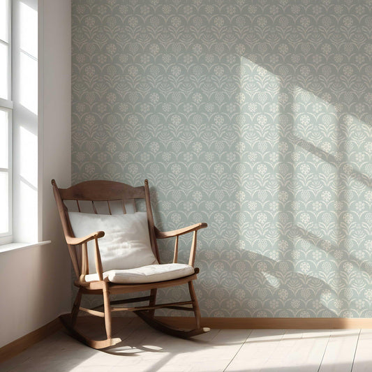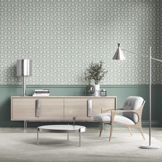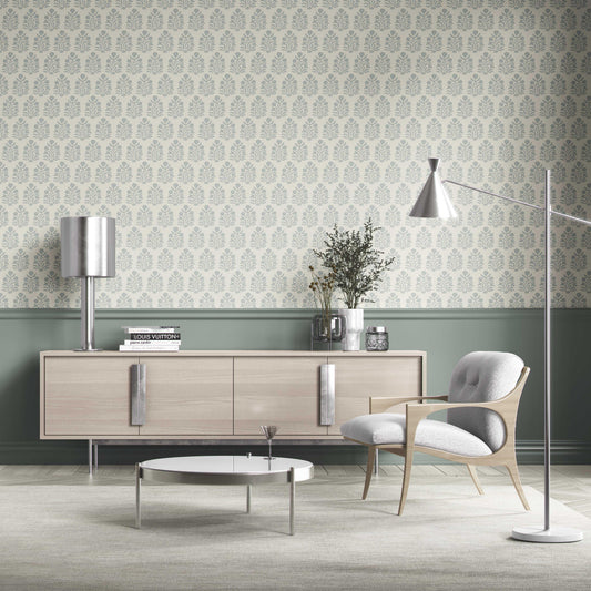 'Aether' Vintage-Inspired Floral Block Print Wallpaper by the Metre (Cream/ Blue-Green)