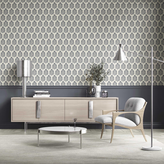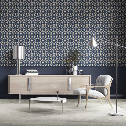 'La Mariee' Vintage-Inspired Botanical Floral Block Print Wallpaper by the Metre (Navy Blue/ Beige)