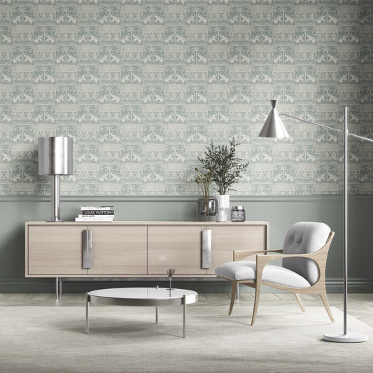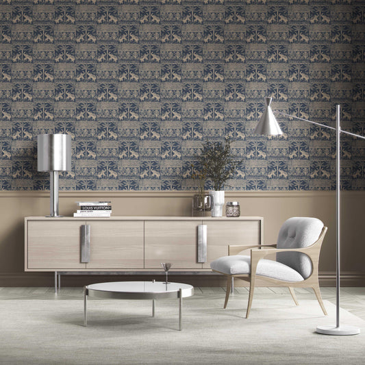 'Femme Fatale' Ethnic/ Heritage Elephants & Animals Print Wallpaper by the Metre (Smoky Blue/ Beige)