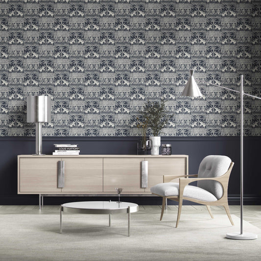 'On-Screen Kiss' Ethnic/ Heritage Elephants & Animals Print Wallpaper by the Metre (Navy Blue/ White)