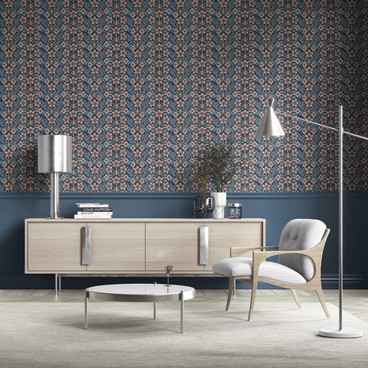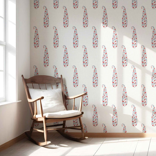 'Bellini' Ethnic/ Vintage-Inspired Floral Paisley Wallpaper by the Metre (Red/ Navy Blue/ Off-White)