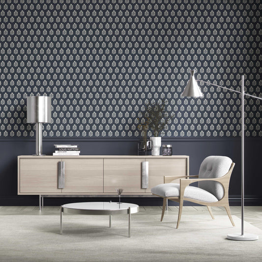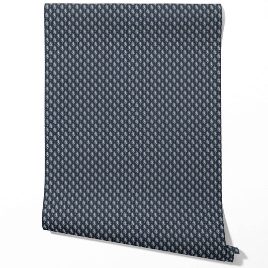 'Baillet' Vintage-Inspired Floral Block Print Wallpaper by the Metre (Navy Blue/ Cream)
