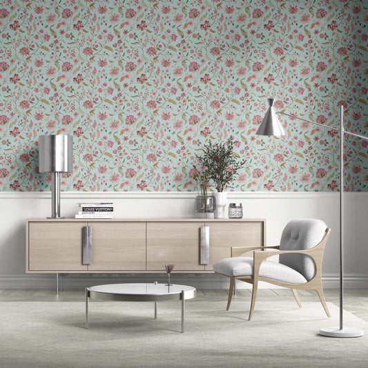 'June Afternoon' Vintage-Inspired Botanical Floral Block Print Wallpaper by the Metre (Duck Egg Blue/ Cream)
