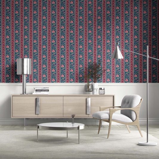 'Brevity' Floral Botanical Striped Wallpaper by the Metre (Navy Blue/ Red/ Gray)