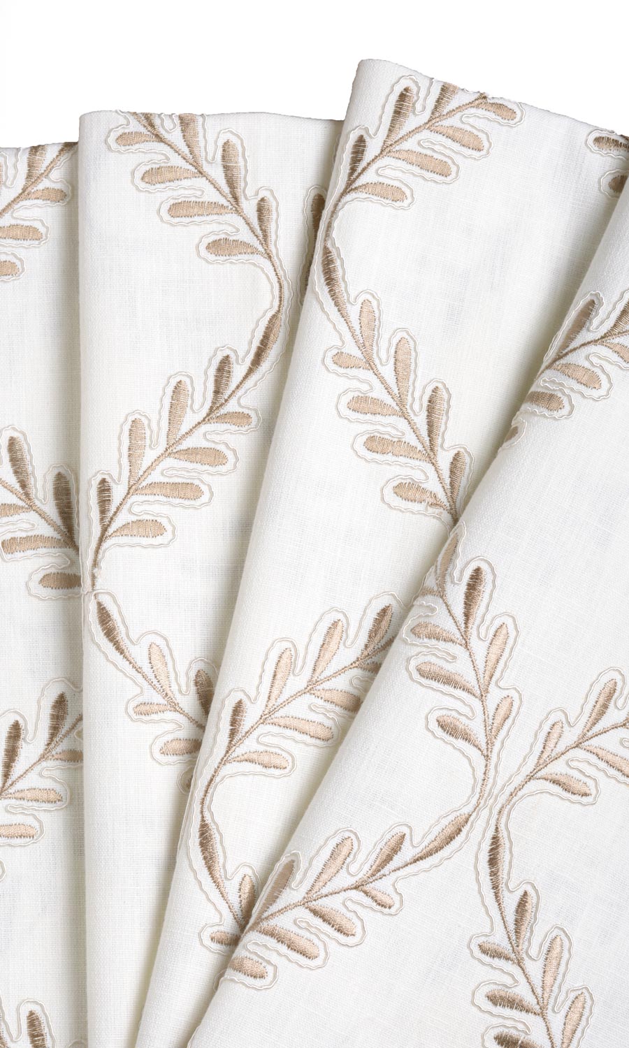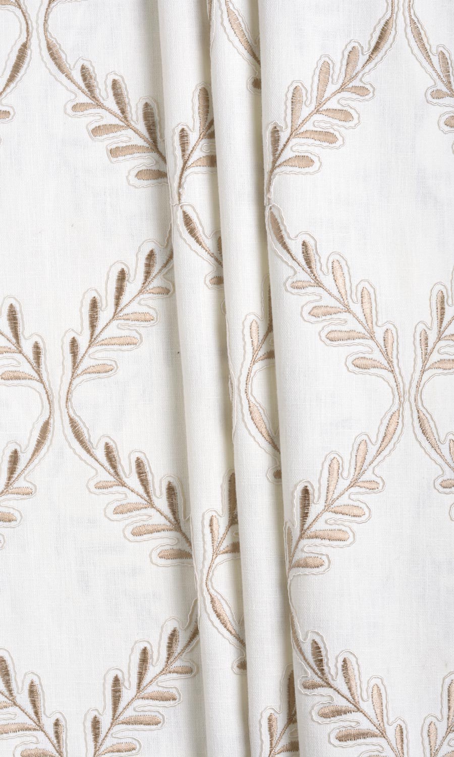 Botanical and geometric motifs merge in 'Dawn Pie' to render a nature-inspired aesthetic with a modern flair. Its delicate leaf vines surging upward in a lattice pattern carry curvy details, embroidered texture and subtle colour contrast for visual allure. Enriched by both the airy elegance of pure linen and the structural quality of polyester, this fabric promises to drape smoothly, fall elegantly and fold neatly.