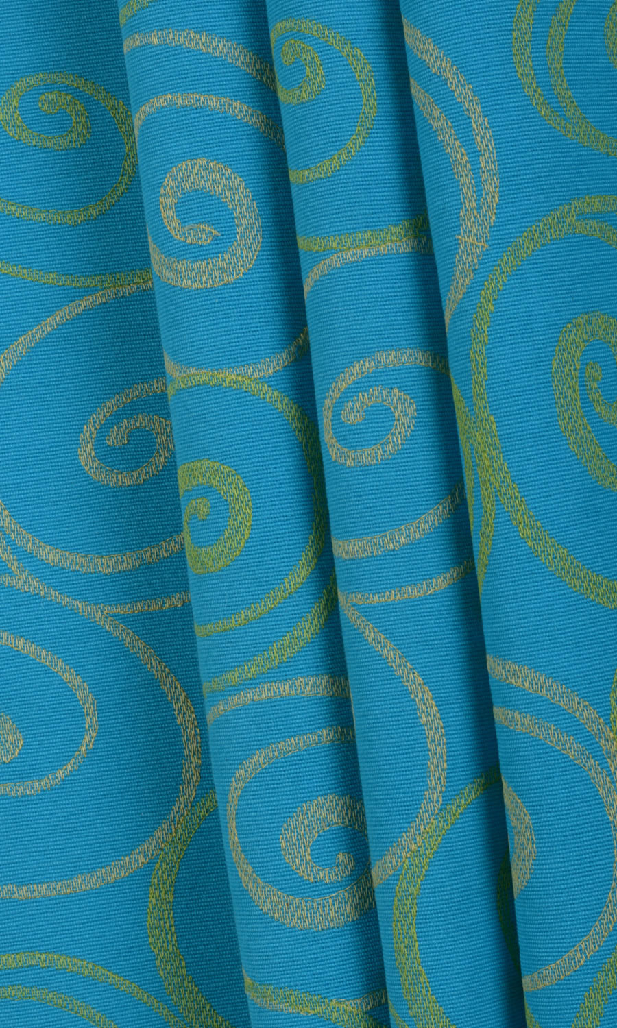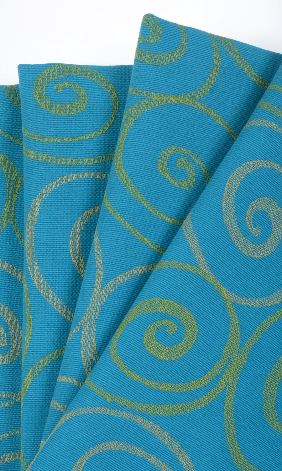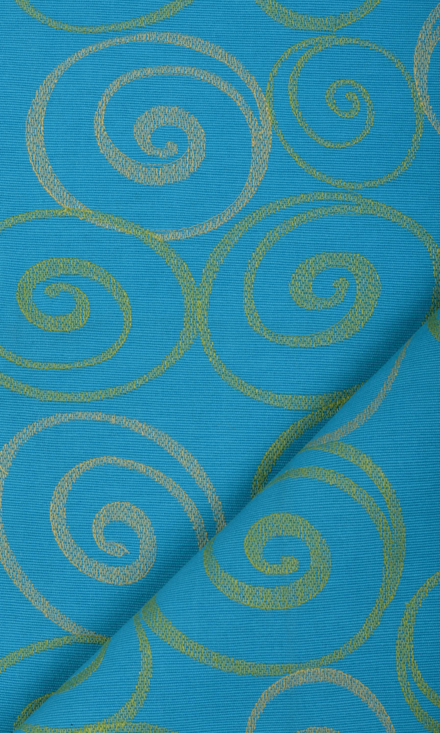 - Its aqua blue energized by crisp chartreuse green accents in a rich woven texture