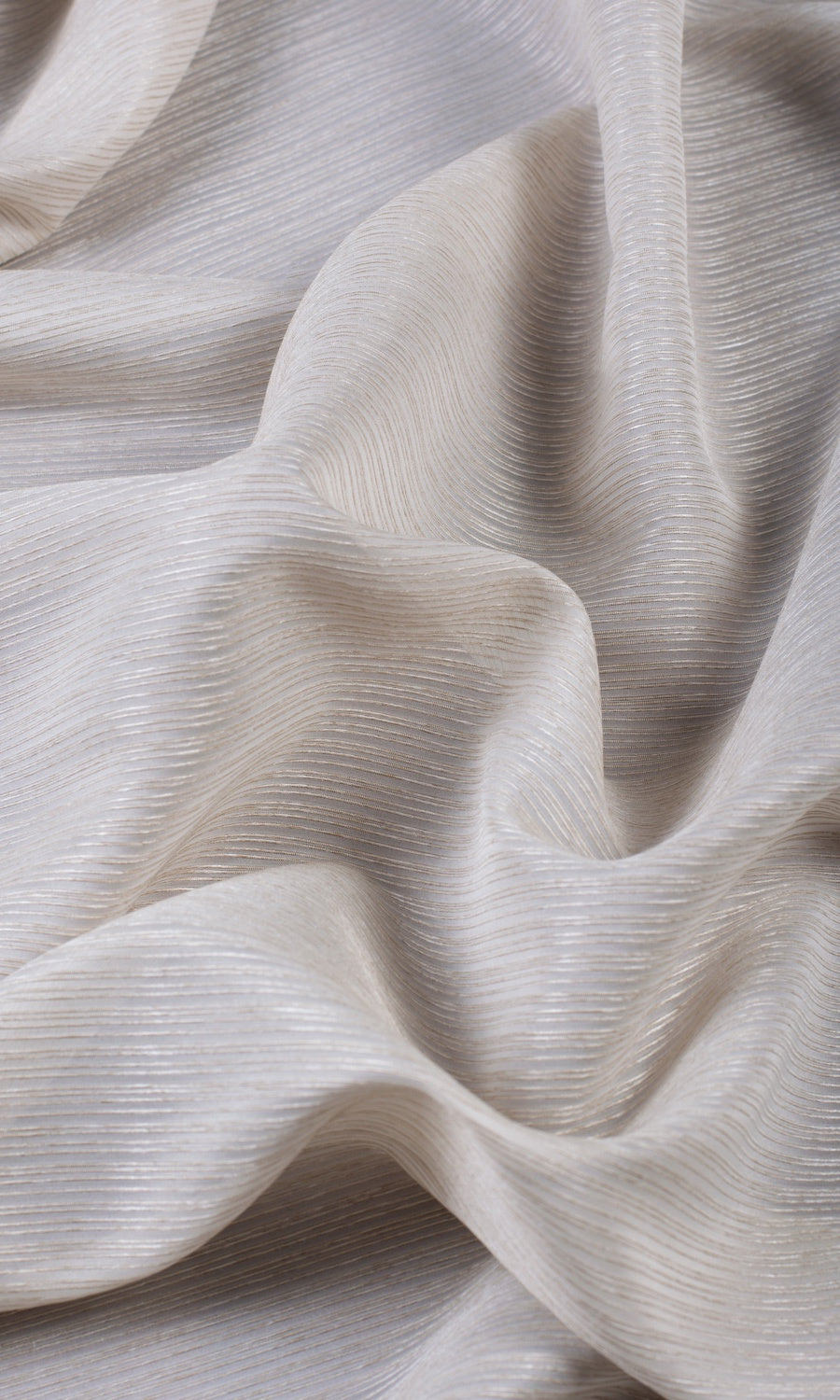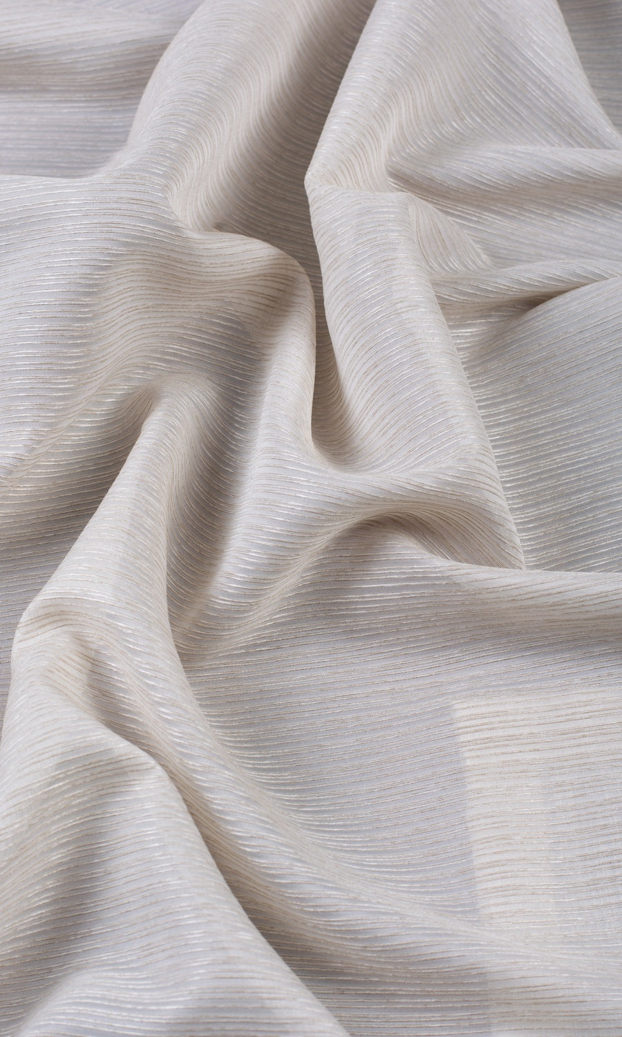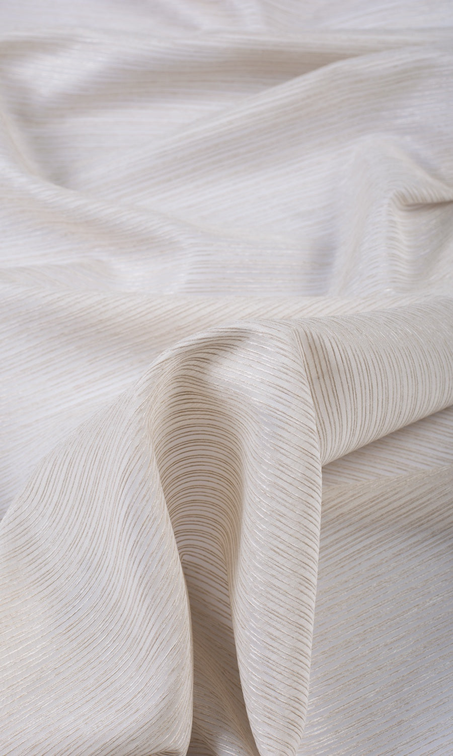 Soft hued, gently radiant and feather-light, 'Jacaranda Hat' is a sheer fabric that can turn any space into a visual delight. Its distinct pattern of narrow stripes emboldened by raised texture and a subtle glint is reminiscent of desert sands combed by strong winds. Enjoy the sun's golden light filtering in through this ivory-beige sheer while your privacy is safeguarded without any compromise.