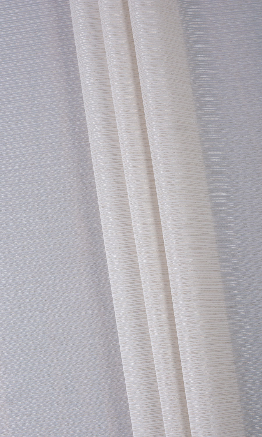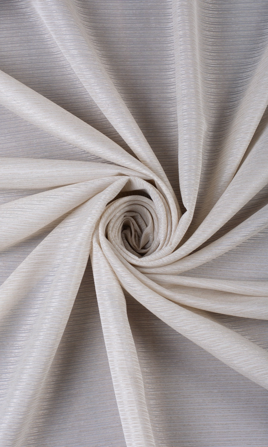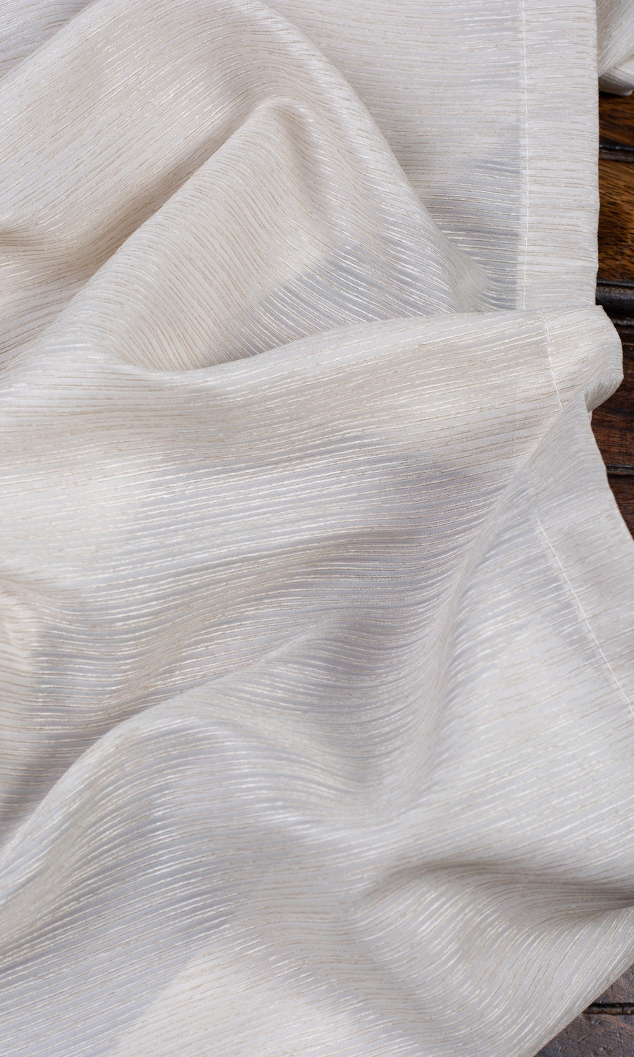 Soft hued, gently radiant and feather-light, 'Jacaranda Hat' is a sheer fabric that can turn any space into a visual delight. Its distinct pattern of narrow stripes emboldened by raised texture and a subtle glint is reminiscent of desert sands combed by strong winds. Enjoy the sun's golden light filtering in through this ivory-beige sheer while your privacy is safeguarded without any compromise.